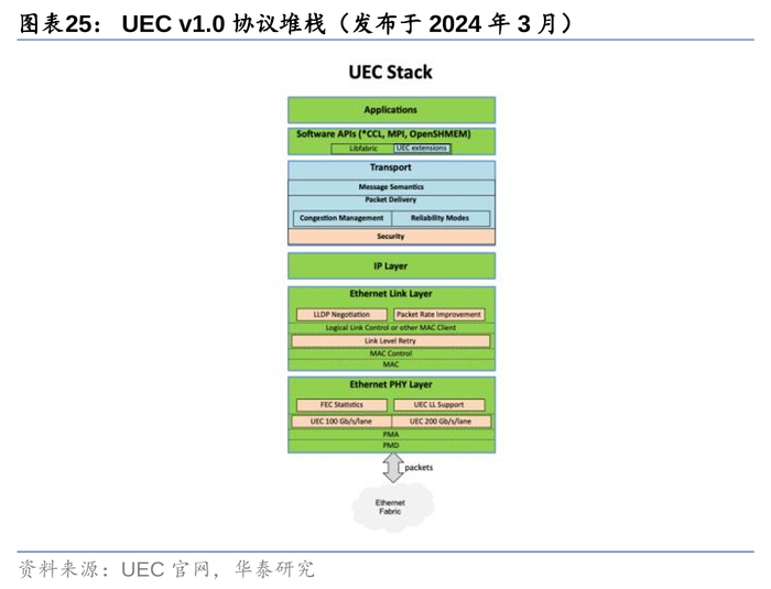 1)海外来看,UEC(Ultra Ethernet Consortium)超以太网联盟是在2023年7月由微软、Meta、博通、思科、Arista等12名成员创立的,旨在超越现有的以太网功能,例如RDMA以及RoCE,提供针对AI/HPC进行优化的高性能、分布式和无损的传输层,对标英伟达的传输协议InfiniBand。截至2024年11月,UEC已经发布1.0标准规范的预览版。新华三、锐捷等国内以太网交换机厂商亦于23年末成为UEC会员;
