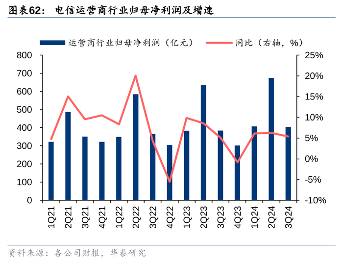 从Q3业绩来看,2024年第三季度电信运营商行业实现营业收入4635亿元,同比增长1.4%。实现归母净利润405亿元,同比增长5.34%,整体业绩延续稳健态势。其中,利润增速高于收入增速,主要得益于:1)5G建设步入尾声,进入投资回收期,资本开支步入下降通道,为利润释放提供了坚实保障;2)运营商持续推进降本增效,坚持精准投资,优化运营效率。展望2025年,我们认为运营商基本盘业务仍将保持稳健,且在国资委“一利五率”考核背景下,运营商盈利能力及投资者回报有望持续提升。