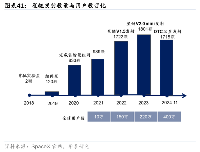 复盘2024年,海外SpaceX商业化持续迈进,国内卫星互联网产业实现从0向1的跨越。1)海外方面:截至2024年11月23日,SpaceX 2024年共执行120次航天发射任务,包含114次猎鹰九号火箭发射,2次猎鹰重型发射,4次星舰发射,其中第五次星舰试飞中超重型助推器成功实现发射塔“筷子回收”。根据SpaceX预计,2024年底前将执行完另外21次猎鹰9发射任务。星链卫星总发射颗数达7368颗,直连手机的星链卫星总发射数达到了311颗,目前SpaceX正在向FCC推进3万颗星座的申报工作。星链服务落地全球100余国、用户数突破400万,预计最早于12月推出手机直连卫星服务。
