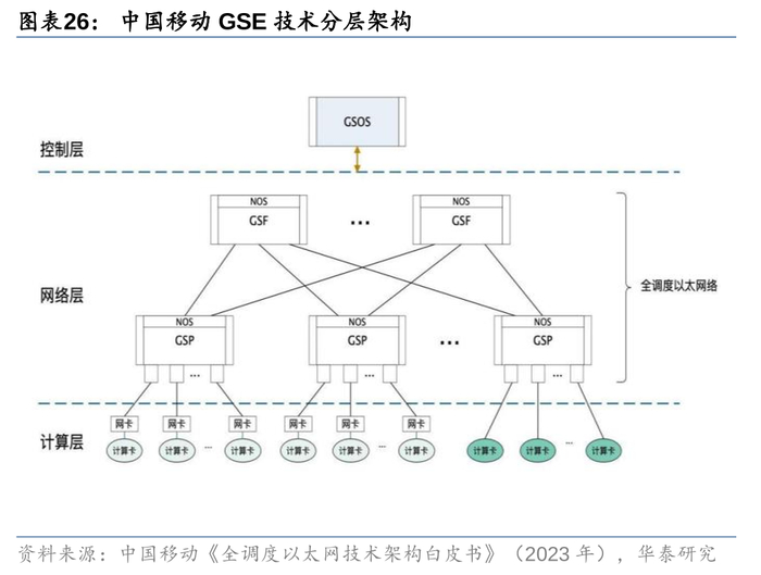 2)国内来看,中国移动牵头的全调度以太网体系(GSE)标准正在不断完善,9月2024中国算力大会上中国移动发布GSE 1.0/2.0相关的体系标准和商用产品,我们观察到GSE相对传统RoCE具有众多优势:I.针对集成网卡和非集成网卡GPU均有方案提供,同时满足万卡集成场景(如华为昇腾910系列)及独立网卡GPU服务器(如英伟达H800系列);II.具有更优异的负载均衡及拥塞控制能力;III.相同芯片容量下,GSE组网能够提供相比传统RoCE方案更高的规模拓展能力。