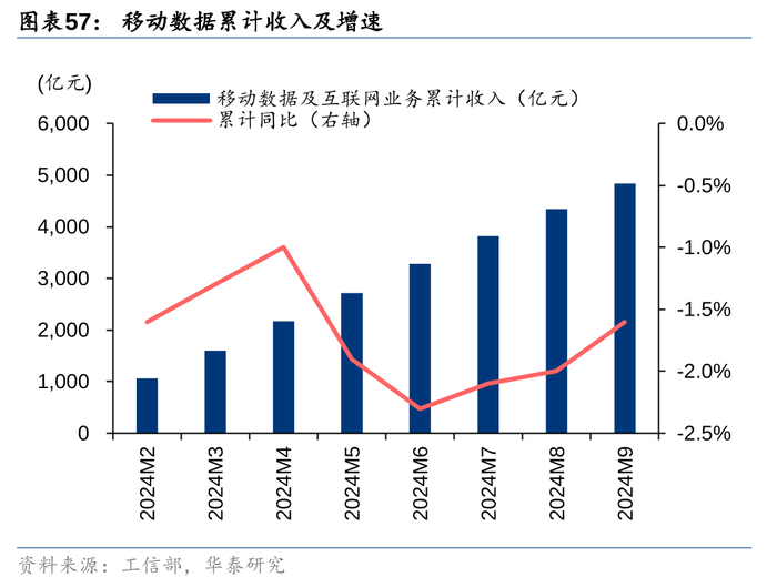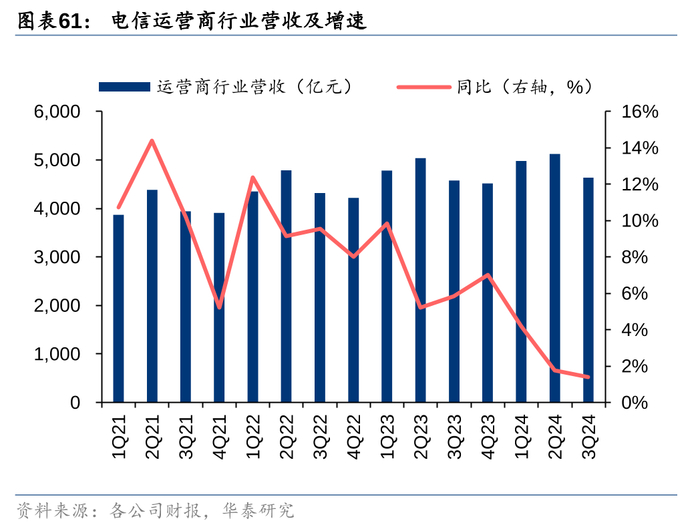 经营业绩层面,据工信部统计,2024年1-9月国内电信业务收入稳步增长,电信业务总量增速保持稳健,其中,移动用户流量收入略有下滑,固网宽带业务保持平稳增长,云计算/大数据等新兴业务较快增长。具体而言,2024年1-9月国内电信业务收入累计完成13152亿元,同比增长2.6%;移动数据流量业务收入4840亿元,同比下降1.6%;固网宽带业务收入2044亿元,同比增长4.2%;新兴业务完成业务收入3252亿元,同比增长9.4%,其中云计算和大数据收入分别同比增长9.4%和61.8%,物联网业务收入同比增长13%。