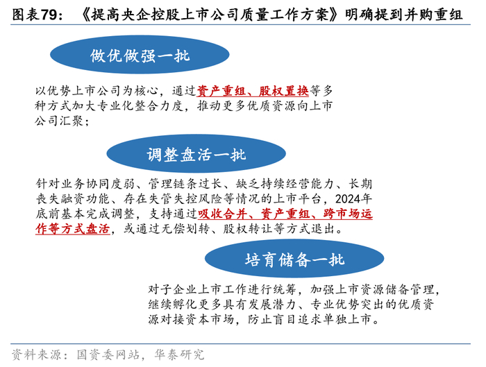2024年是提高央企控股上市公司质量的收官之年,我们认为并购重组作为重要工具有望加速推进。2022年5月,国资委发布《提高央企控股上市公司质量工作方案》,提出3年内做优做强一批、调整盘活一批、培育储备一批上市公司,其中前两项工作思路明确提到并购重组:1)做优做强:以优势上市公司为核心,通过资产重组、股权置换等多种方式加大专业化整合力度,推动更多优质资源向上市公司汇聚;2)调整盘活:针对业务协同度弱、管理链条过长、缺乏持续经营能力、长期丧失融资功能、存在失管失控风险等情况的上市平台,2024年底前基本完成调整,支持通过吸收合并、资产重组、跨市场运作等方式盘活,或通过无偿划转、股权转让等方式退出。