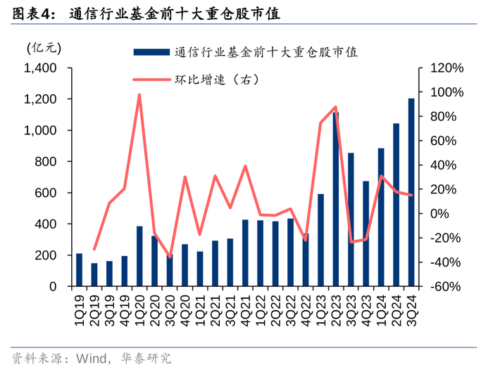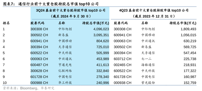 中际旭创、新易盛、中国移动、天孚通信、中天科技位列通信行业3Q24前五大重仓股。从3Q24基金前十大重仓持股总市值来看,排名前五的个股分别为中际旭创、新易盛、中国移动、天孚通信、中天科技,持股总市值分别为409.60亿元、309.54亿元、80.46亿元、72.50亿元、50.60亿元。