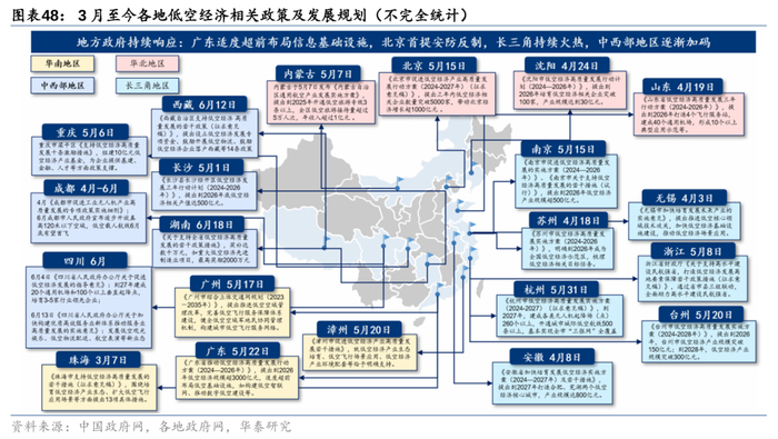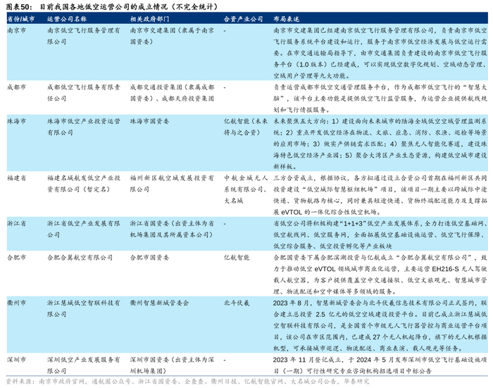 2025年关注点#2:地方低空运营公司或迅速涌现。我们认为,低空产业要能实现商业闭环并产生持续稳定的经济效益,运营公司的组建成立必不可少。从具体的成立模式上来看,我们此前提出“地方政府(+X)”的模式,自深圳、合肥先行成立低空产业服务公司后,我们看到浙江、福建、珠海、成都等地也在陆续成立此类公司,这些公司中部分由政府独资成立,部分由政府和关键设备或基础设施提供商联合成立(如合肥与亿航智能合资、衢州与北斗伏羲合资等)。运营公司成立通常标志着该城市低空商业化进程的起步,因此建议关注重点地市低空运营公司的成立情况来判断产业进程。