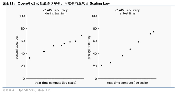 继训练场景之后,推理侧有望成为AI算力链需求的新增动力。2024年9月,OpenAI重磅发布其最新AI模型OpenAI o1,o1模型最鲜明的特征是其卓越的推理能力,尤其在数学和编程领域的出色表现,该模型通过使用思维链模式,有助于识别和纠正自己的错误。且通过OpenAI的研究发现,通过增加思考时间,模型的推理性能呈现持续提升,即Scaling Law正在AI推理领域浮现。另一方面,结合随着2025年AI应用有望逐步落地的背景下,我们认为AI推理侧需求有望成为AI算力链需求增长的新动力。