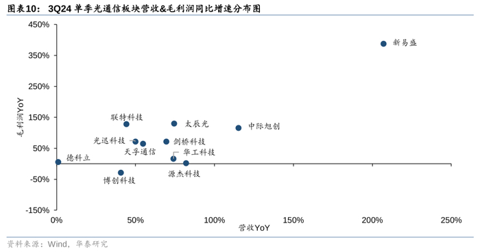 通过梳理光通信板块2024年三季报,我们观察到头部公司业绩延续快速增长,且板块景气度呈现扩散趋势:随着400G、800G光模块需求延续高增长,头部厂商Q3业绩进一步兑现,随着后续1.6T产品的导入,业绩均有望延续快速增长。另一方面,MPO头部厂商Q3收入与归母净利润加速增长,继续印证MPO市场景气度拐点;剑桥科技、联特科技受益于海外客户需求增长,业绩亦呈现同比快速增长;国内市场方面,随着400G光模块需求的启动,光迅科技、华工科技等厂商Q3业绩进一步上行。此外上游光芯片、光器件厂商源杰科技、剑桥科技、腾景科技等公司Q3收入端亦呈现同比快速增长趋势。