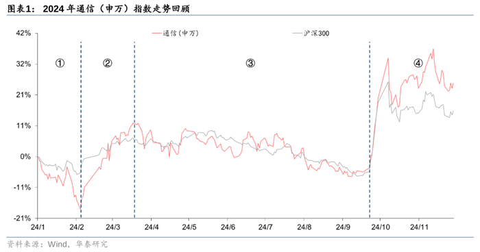 回顾2024年初至12月9日,通信(申万)指数累计涨幅为26%,跑赢沪深300(+17%),在31个申万一级行业中位列第4位。细分来看,其中光模块、铜连接、电信运营商、液冷等板块均收获较好涨幅,此外卫星互联网、低空经济、车路云等主题板块相关标的亦有轮动表现。2024年通信板块走势大致可划分为以下四个阶段: