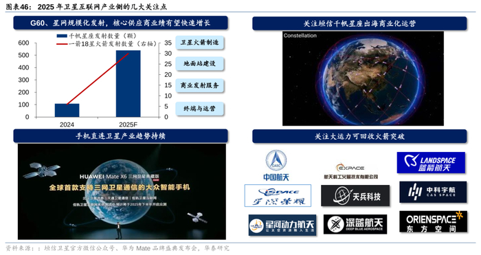 展望2025年,我们认为产业侧有几大关注点:1)低轨星座密集组网,25年千帆星座将发射540颗卫星,星网也有望进入密集发射期;2)垣信落地巴西、马来西亚, 25年出海步伐有望显著提速,为地面站、用户终端等环节提供发展机遇;3)手机直连卫星趋势持续,星链、AST存量手机直连卫星将商用落地,华为Mate X6支持低轨卫星互联网引领产业潮流,直连手机功能将于25H2开启公测;4)火箭产业链值得关注,SpaceX星舰向全箭可回收目标迈进,我国火箭可回收将推动产业快速降本。