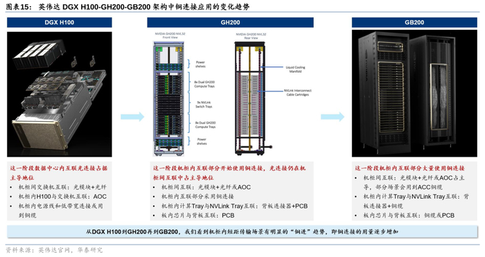 从DGX H100到GB200“铜进”趋势明显,我们认为铜连接仍为数据中心内部短距传输优选方案。回顾英伟达服务器架构的变化,从DGX H100到GH200再到GB200,呈现出明显的“铜进”趋势。我们认为,随着GPU单卡算力升级,对传输带宽要求也同步提升,同时机柜集成度增加、算力密度增加,也缩短了传输距离,在机柜内短距传输场景中,铜连接能够以较低的成本、更低的功耗实现与光连接相近的高速传输能力,且经由屏蔽设计的铜缆相比PCB连接能提供更优异的传输信号完整性和抗电磁干扰性。综合来看,高速铜连接在现代AI集群短距传输中优势凸显,我们判断未来机柜内部铜连接应用仍将呈增长趋势,且随着集群密度的进一步提升,机柜间亦有望增加铜连接的使用。