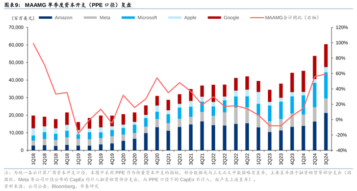 3Q24北美云厂商合计资本开支创历史新高,2025年有望继续加码。3Q24单季度MAAMG(微软、亚马逊、苹果、Meta、谷歌)合计资本开支同比提升59.12%至608.01亿美元,继续创历史新高。根据Factset一致预期,2024年MAAMG合计资本开支预计同比增长41%至2203亿美元。各家在3Q24业绩会中均表达出对未来资本开支的积极态度:微软指引四季度资本开支将环比增加,同时表示FY25的资本开支将高于FY24;谷歌指引2025年资本开支相比2024年有进一步增长,并且曾强调对AI投入不足的风险远高于投资过度的风险;亚马逊预计2024年的资本支出约为750亿美元(含融资租赁),2025年资本开支将继续增长;Meta再度上调2024年资本开支计划至380-400亿美元(上季度指引范围为370-400亿美元),并仍然表示2025年资本支出将大幅增长。我们认为北美云厂商对于AI领域的投资强度仍然呈现继续加码态势,在此背景下,我们看好2025年AI算力产业链高景气度的延续。