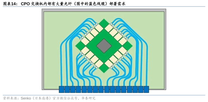 CPO交换机内部预计带来光引擎、保偏MPO部署需要。CPO交换机带动了光引擎与MPO内部部署需求,以上均相较于传统交换机(内部为电信号)形成增量需求。以51.2T CPO为例,根据Senko(日本扇港)方案,在交换ASIC周围共部署16个光引擎,每个光引擎含有32个通道,单通道速率为100G,共实现51.2T的总速率。使用完全并行的光纤方案时,每个通道均需要2根光纤(1收+1发),故单台CPO内部共需要1024根光纤。另一方面,由于CPO内部的光引擎通常采用硅光方案,而硅光波导对输入光具有偏振敏感性,不同偏振态的耦合损耗有所不同,所以当CPO采用外置光源方案时,内部光纤连接器有望引入保偏MPO的使用,带来MPO市场空间的进一步打开。