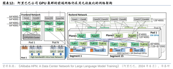 推理需求涌现背景下,我们看好光模块需求的持续性。市场普遍担忧AI推理对于高速光模块需求或较训练侧有所放缓。而我们认为未来随着多模态大模型的不断推进,相较于文字生成场景,图片生成、视频生成等应用的不断发展或对于AI推理网络吞吐量、通信带宽等要求进一步提升,对于高速光模块的需求有望释放;另一方面,随着云厂商GPU集群更多地面向外部用户租用,用户侧对训练与推理的使用较难提前规划,且通常会有训练与推理需求并发的混合场景,故我们预计云厂商仍倾向按照训练的架构进行组网(训推一体),该架构下GPU集群仍保持对高速光模块的饱满需求。根据阿里巴巴发布的论文《Alibaba HPN: A Data Center Network for Large Language Model Training》,其前端网络(推理侧)的架构仍采用了无阻塞胖树架构,有望进一步带动光模块需求的释放。
