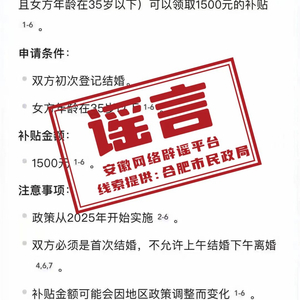 近日,网络上流传安徽省合肥市从2025年1月1日起,“初次结婚登记可以领取1500元补贴”、“下载相关APP即可领补贴款”、“新人结婚登记可领取黄金购买优惠券”等均为虚假信息。合肥市民政局官网声明:合肥市并未研究、出台有关结婚登记的补贴政策,望广大市民注意甄别!