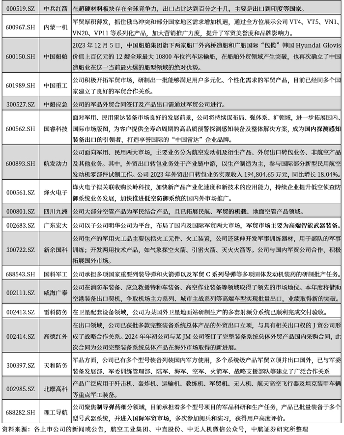 ②业务类型:军工央企有望加强装备体系化出口,民参军企业可借机向下游总装市场拓展