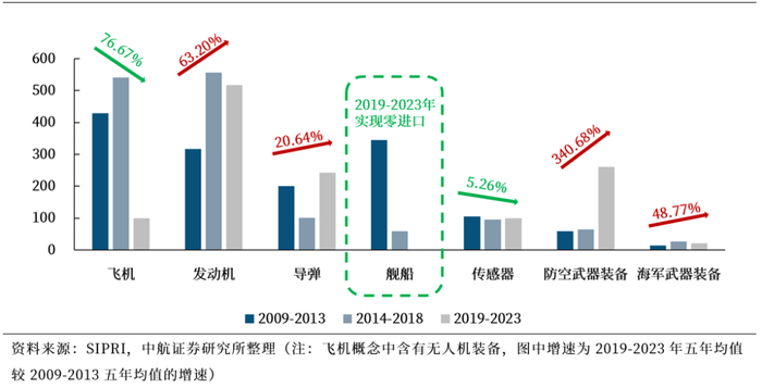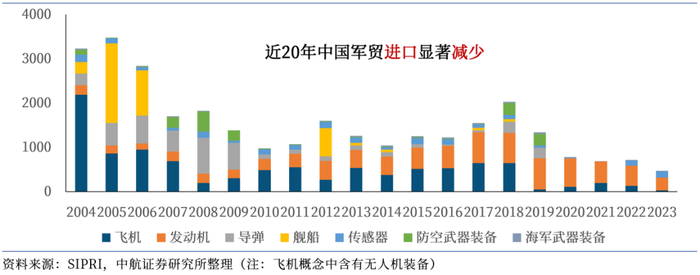 从我国近年来武器装备进口来看,以航空航天为代表的高端信息化武器装备进口量正在持续下降,其中舰船在近五年来实现零进口。伴随航空发动机国产替代的不断推进,我们预计当前占我国军贸进口比例较大的发动机领域的进口指标也将有望逐步下降。