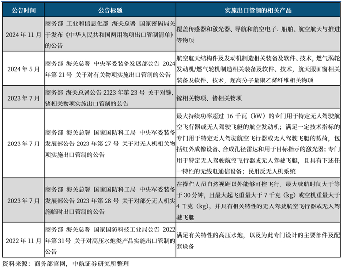 与此同时,2022年以来,我国商务部、海关总署、国家国防科工局等发布的出口管制公告中,实施出口管制的产品包括无人机、传感器、航空航天结构件及发动机制造相关装备等。商务部表示,出口管制不是禁止出口,出口符合相关规定的,将予以许可。实施出口管制,旨在维护国家安全、履行国际义务。2024年11月,商务部会同有关部门相继发布《中华人民共和国两用物项出口管制条例》(简称《条例》)和《中华人民共和国两用物项出口管制清单》(简称《清单》),自2024年12月1日起实施。商务部表示,统一的《清单》将有利于引导各方全面准确执行中国的两用物项出口管制法律政策,有利于提高两用物项出口管制治理效能,更好地维护国家安全和利益、履行防扩散等国际义务,更好维护全球产业链供应链安全稳定畅通。我们认为,有法可依方可市场有序,《条例》和《清单》的发布打消了市场对两用物项出口全部“一刀切”的疑虑,有利于维护世界和平和周边地区稳定,促进合规贸易发展,对我国军工产业链供应链的健康有序发展和军贸出口具有积极意义。