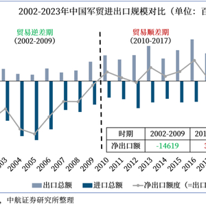 最近两年来,随着国际局势的波云诡谲,俄罗斯等传统军贸大国的出口缩减,同时受益于我国国防科技工业体系的完善和国产替代能力的提升,我国军贸出口量显著增长,带动净出口额显著提升。我国或将进入下一个贸易顺差期。
