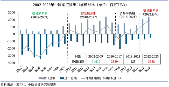 受益于我国通过军费在武器装备方面的长期投入,近年来,国产装备质量和种类均获得了显著的提升。根据SIPRI的军贸趋势指标,中国军贸进出口实现此消彼长的趋势。我们根据中国军贸的进出口平衡情况,将其划分为四个时期,即贸易逆差期(2002-2009年)、贸易顺差期(2010-2017年)以及贸易平衡期(2018-2021年)以及贸易顺差期(2022年始),具体各阶段特点如下: