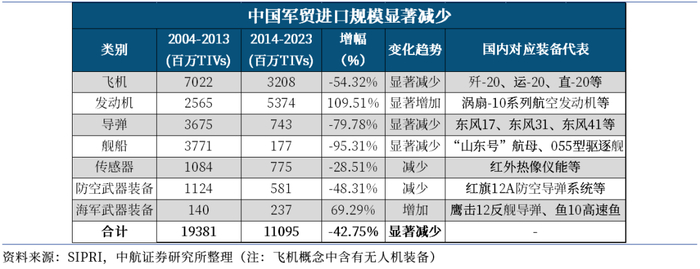 中国近十年(2014-2023年)的军贸进口110.95亿TIV,相较于上一个十年(2004-2013年)军贸进口(193.81亿TIV)下降42.75%,主要系飞机(含无人机)、导弹、舰船等武器装备的进口指标大幅下降。