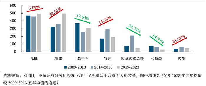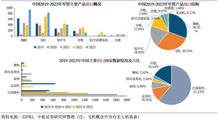 从我国具体出口的武器装备种类来看,2019-2023年,除装甲车、防空武器装备等占比较小的武器装备外,我国主要军贸产品的出口指标均出现了不同程度的提升。以2009-2013年为基准,可以发现,近年来增速较大且维持在高位的武器装备种类主要为飞机(含无人机)、舰船、导弹、火炮等航空航天装备。我们认为,一方面原因在于近几次信息化战争(亚阿冲突、以色列周边冲突及俄乌冲突等)中,无人机、导弹等具备较高效费比的武器装备得到突出体现;另一方面,从近年来珠海航展上亮相的各类出口飞机(含无人机)、导弹装备型号受到了客户的广泛关注来看,伴随我国航空航天装备技术发展迅速,相关军贸出口装备“物美价廉”的优势得到了进一步巩固。