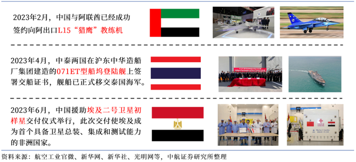 经过几十年的投入,我国的军工行业已基本具备“内循环”的技术基础和物质条件。当前,国际军贸市场对“质美价优”武器装备的需求日益旺盛,这使得中国军贸在国际市场上的竞争优势正在不断提升。2023年以来,中国已与阿联酋签约出口L15教练机,面向泰国交付舰船,援助埃及卫星(详见下图)。