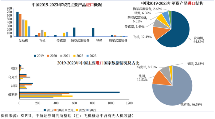 进口方面,过去五年,随着国防工业体系的逐步完善,中国军贸进口指标有所下降(39.93亿TIV,-43.71%),占全球比例亦同步下降(2.85%,-2.05pcts)。从武器装备上看,发动机仍然是中国军贸进口的主要产品,过去五年合计占比达到64.82%。