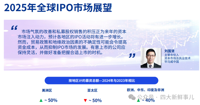 “除亚太地区外,全球IPO市场在2024年势头强劲,是一个很好的迹象, 因此我们对全球IPO市场在2025年的前景保持审慎乐观的态度。然而,贸易政策和地缘政治的不确定性,尤其是美国新政府上台所带来的影响,确实为这种乐观情绪蒙上一层阴影。市场上各个利益相关者必须合作,以确保一个稳定的环境来支持全球资本市场的增长和繁荣。”