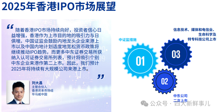 “随着香港IPO市场持续向好,投资者信心日益增强,香港作为上市目的地的吸引力与日俱增。中国证监会鼓励内地龙头企业来港上市以及中国内地计划适度地宽松货币政策将继续推动IPO趋势。而更多中东证券交易所获纳入认可证券交易所列表,预计将吸引个别中东企业来港作第二上市。因此,我们预计2025年将持续有大规模公司来港上市。”
