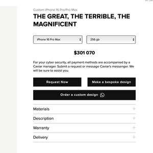 Caviar针对苹果的iPhone 16系列,最新推出opulent系列,其中最大的亮点就是在 iPhone 16 Pro Max上,定制“The Great,The Terrible,The Magnificent”款,声称设计灵感来自源自伊凡雷帝、苏莱曼大帝和查理曼大帝三位帝王的皇冠。