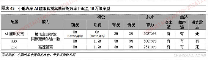 小鹏汽车智驾成本下降和配置下沉步伐较快,已将高阶智驾下沉到15万级。起售价18.68万元的P7+首发AI鹰眼视觉(无激光雷达),全系标配AI智驾,小鹏AI智驾用一套软件适配全车型、全车系。AI鹰眼视觉整套硬件成本估计相较此前带激光雷达版本下降一半左右。预计于2025年上半年交付的小鹏MONA 03售价15.58万,搭载AI鹰眼视觉方案,可实现高阶智驾。