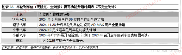 国内方面,2024年11月28日理想汽车官方宣布开启全量推送车位到车位智驾功能。小鹏汽车宣布基于小鹏图灵AI智驾体系,将在AI天玑5.5.0上全量推送车位到车位功能,由于小鹏的方案以一套软件逻辑来打通地库、闸机、城区道路等场景,使得小鹏汽车在实现车位到车位无断点的基础上智驾体验不割裂。
