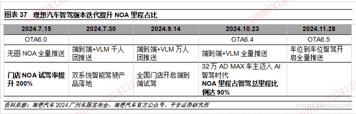 高阶智驾拟人度+泛化性快速提升,智驾将成影响购车决策的关键因素。智驾里程增加使得系统迭代速度加快(系统迭代以天计),智驾系统场景适应性(有路就能开)、拟人程度、通行效率(接管次数降低)等维度的优化节奏加快,车主会开始逐步信任并乐于使用智驾系统,从而进入越用越好、越用越广的正循环。何小鹏认为过去用户购车决策最重要的是车的大小、动力、安全等因素,他预计下一个十年AI在购车决策中的权重会接近50%。理想汽车智驾负责人郎咸朋表示:理想全国门店开启无图NOA试驾后,理想汽车城市NOA日均里程提升3倍,城市NOA日均活跃度提升8倍。30万元以上车型AD Max销量占比达到近70%,40万以上车型AD max占比超80%。根据据理想汽车在2024广州车展智能发布会,2024年10月理想汽车用户的NOA里程占智驾总里程比例从2023年底的70%提升到了90%。在无图NOA推送后,NOA的可用范围大幅增加,体验的提升带来了用户依赖度的提升。2024年底“车位到车位”的全量推送有利于NOA里程占比进一步上升.