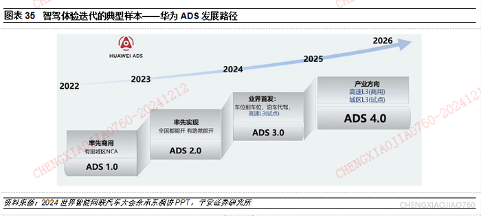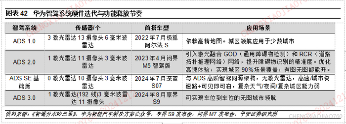 华为ADS:从华为ADS 1.0到3.0,华为智驾方案总体趋势是传感器数量变少、车端算力利用率更高,使得车端智驾硬件成本得以快速降低,从而使得适配的车辆价格带得以不断下沉。当前鸿蒙智行车型全系标配华为ADS,但有基础版和高阶智驾版之分。