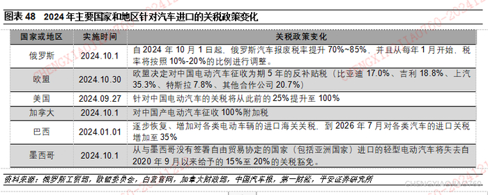 主要汽车出口目的国在2024年均增加了对我国汽车出口的贸易壁垒。我国汽车出口由此前的年均100万台增长到2024年的接近600万台,4年时间我国已成为全球第一大汽车出口国。但伴随我国汽车出口销量的快速增长,主要汽车出口目的国在2024年增加了对我国汽车出口的贸易壁垒。我国第一大汽车出口目的国俄罗斯宣布自2024年10月再次大幅提高汽车报废税;欧盟决定针对中国产电动汽车征收额外的反补贴税;巴西、墨西哥在2024年也针对汽车进口增加了关税;美国、加拿大宣布对中国产电动汽车征收100%的关税。我们认为随着我国汽车出口的增长,贸易壁垒增加不可避免,考虑到目前我国汽车出口销量已经接近600万台,我们认为我国汽车产业全球化的第一阶段暂告一段落,过去依靠粗放式的贸易出口的模式在未来将面临更多的不确定性。