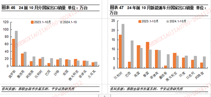 俄罗斯、巴西、阿联酋成为2024年汽车出口核心增量市场。俄罗斯在2023年成为我国汽车出口第一大市场,2024年俄罗斯市场依然保持较快的增长,根据乘联会统计,2024年1-10月我国对俄罗斯汽车出口达到95.7万台,同比增长30%,俄罗斯出口在2024年增量贡献依然较大。除俄罗斯外,2024年巴西、阿联酋出口增量居第2、3位,根据乘联会统计,1-10月我国对巴西、阿联酋汽车出口分别达到21.8万/26.2万台,同比分别增长183.3%/113.0%。