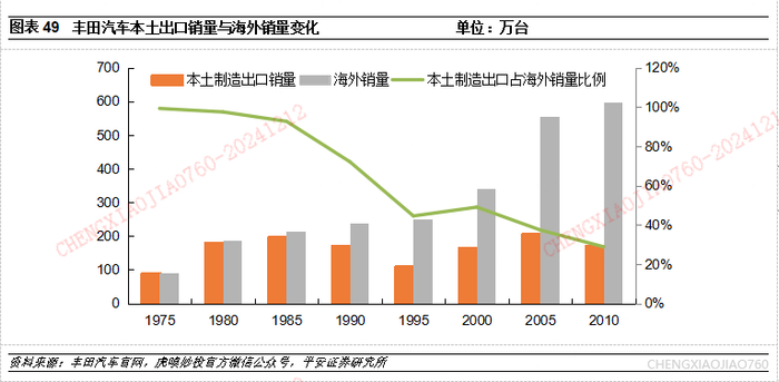 整车出口阶段:20世纪70年代的石油危机为丰田汽车的出海创造了机遇,丰田汽车凭借小排量、低油耗的优势占领北美市场,在这一阶段,丰田汽车的出海主要以国内制造,海外出口为主。