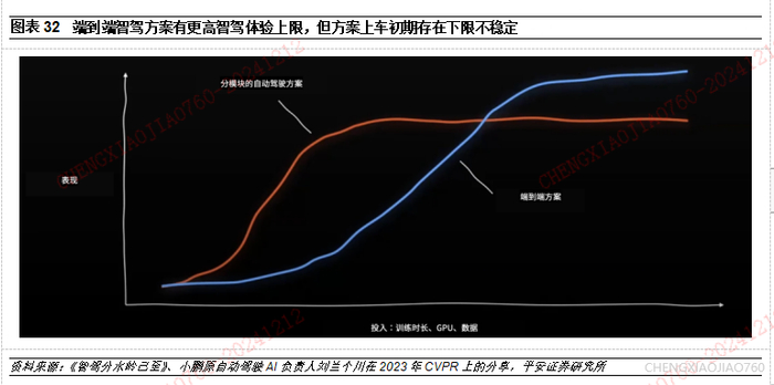 国内智驾方案迭代速度明显加快,无断点的全场景智驾已逐步释放。复盘本土智驾演进节奏,2023年之前我国智驾发展处于车端智驾软硬件打基础阶段,如小鹏在2021初推出基于英伟达Xavier平台的高速领航功能,理想2022年中于L9首次搭载英伟达Orin支持高阶智驾功能。智驾迈入城区领航阶段后,基于规则的智驾方案难以为继。2023年底进入城区应用场景后,系统计算复杂度呈指数级上升,用人工规则处理长尾场景的成本越来越高,智驾迭代陷入人海战术的同时体验提升渐小。迈入端到端时代后,大量人工规则被神经网络取代,信号输入到轨迹/控制输出采用同一个深度学习模型,车端感知信息无损传递,智驾方案得到全局优化,车企的数据质量/规模、训练算力成智驾研发壁垒,随着训练里程增加,端到端会取得更高上限。2024年下半年开始智驾领先车企加速端到端智驾上车,功能上迈入车位到车位智能驾驶落地阶段。