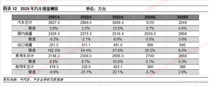 海外市场不确定性增强,国内消费补贴政策预期较强。在全球贸易壁垒增加的大背景下,预计2025年汽车出口增速继续向下,因此内需会是2025年汽车行业的主要着力点,商务部此前表示将提前谋划2025年的汽车以旧换新接续政策,稳定市场预期。假设政策延续,我们预计2025年国内乘用车零售增速有望达到3%以上,叠加出口增长,2025年乘用车销量有望达到2858万台(含国内零售与出口),同比增长4.3%。商用车市场主要取决于经济发展以及市场政策,预计2025年商用车政策相对平稳,我们预计商用车销量同比增长约2%,达到388万台。综上,我们预计2025年汽车销量将超过3200万台,同比增长4%左右。