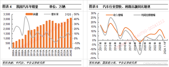 政策刺激叠加出口拉动,全年汽车产销量有望超过3100万台。2024年汽车产销高开低走,24年春节前燃油车销量释放以及节前消费时间长,汽车产销在年初取得开门红,春节后行业价格战升温,消费者观望情绪以及对以旧换新政策的预期逐渐增强,但随着以旧换新政策在下半年的刺激效果显现,以及汽车出口的延续增长,全年汽车批发销量依然实现同比正增长。据中汽协数据,2024年1-10月我国汽车销量达2462.4万台,同比增长2.7%,我们预计2024年汽车销量有望创历史新高达到3120万台,同比增长3.7%。