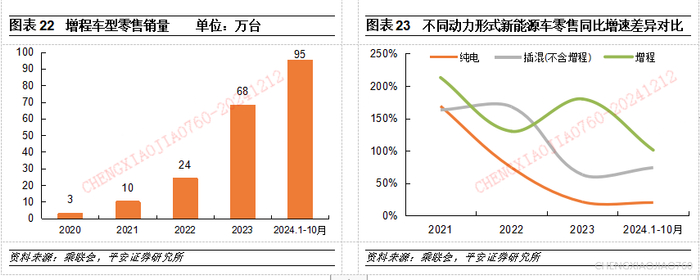 根据乘联会统计的零售数据显示,2024年1-10月增程式乘用车零售销量达到95万台,同比增长101%,预计2024年全年增程车型销量将超过100万台。