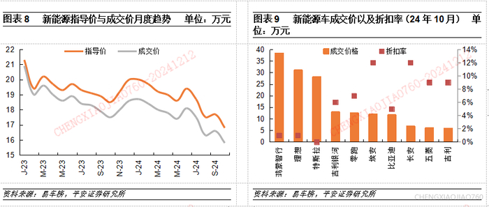 低端新能源车折扣相对更大,新能源成交均价呈下行趋势。据易车榜,24年10月新能源车平均成交价为15.8万元,同比下滑10%。据易车榜统计的新能源车销量TOP10折扣率(24年10月),高端新能源(鸿蒙智行、理想、特斯拉)的折扣率明显低于中低端新能源市场。截至2024年10月,得益于高端新能源M9热销,鸿蒙智行整体成交均价已升至38.3万元,比亚迪的成交价在2024年呈下行趋势,截至24年10月,比亚迪成交均价为11.7万元。