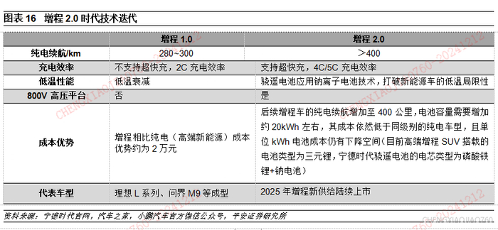 我们认为推动增程车扩容的动力一是源于增程车技术的迭代,二是增程车的成本优势。技术方面,2025年是增程车2.0的元年,增程车的纯电续航可达到400km以上,且具备超快充技术,在使用体验上愈发接近纯电,此外宁德时代骁遥电池采用钠离子电池技术,提升了增程车的低温性能。成本方面,同一车型增程版与纯电版电池容量差异在50kWh时,其价格差大约在2万元左右,即使考虑到后续增程车的纯电续航增加至400公里(电池容量可能需要增加约20kWh左右),其成本依然低于同级别的纯电车型。