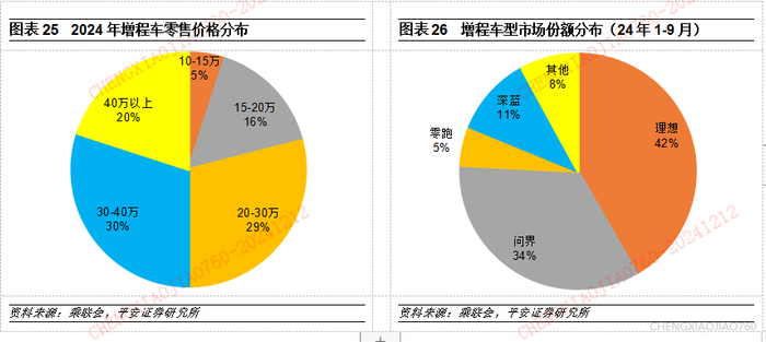理想、问界的存量龙头先发优势突出。目前增程车主要集中在20万元以上的中高端市场,在经济型市场所占据的市场份额相对较低,根据乘联会统计数据显示,2024年1-10月,20万元以上的增程车销量约占全部增程车销量的79%。
