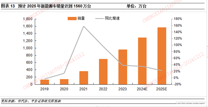 新能源车增长趋势明确,看好增程车在2025年继续放量。2025年国内需求受政策变化的影响存在一定不确定性,但新能源汽车依然是2025年汽车行业增长较为确定的趋势。政策层面,2025年是新能源乘用车免征车辆购置税的最后一年,2026~2027年将对新能源汽车减半征收车辆购置税,因此购置税免征政策对2025年下半年新能源车需求的释放有较大促进作用,我们预计2025年全年新能源车销量有望达到1560万台,同比增长22%。从新能源车结构来看,2024年纯电车增速下滑,插混车成为推动新能源车增长的主要动力,2025年这一趋势会继续延续,尤其在增程技术迭代,新增供给大幅增加的情况下,我们看好增程车型在2025年以及未来的发展空间。