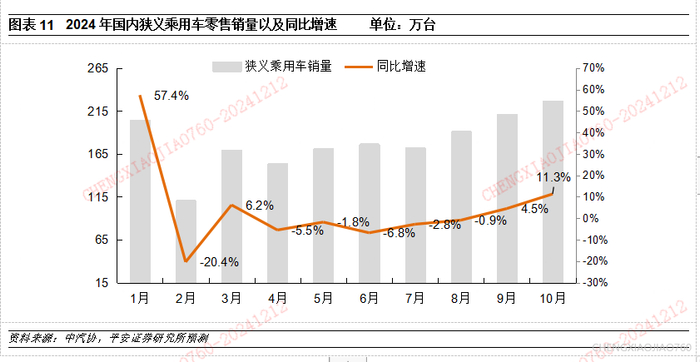 政策刺激效果在24年下半年,尤其是9月份以后逐步显现。据商务部发布的数据显示,截至11月28日,全国报废更新和置换更新补贴申请合计超400万份,24年汽车销量增长很大程度上来源于政策对于内需的刺激。复盘来看,4月份国家的以旧换新政策落地,但补贴力度偏弱,国内乘用车零售连续5个月同比下滑(乘联会数据)。7月份补贴力度加大,各地方政府也陆续出台并落实汽车置换补贴政策,同时伴随汽车消费进入旺季以及众多新车型的上市,汽车终端需求逐渐恢复,24年9月份,国内乘用车零售已同比实现转正。