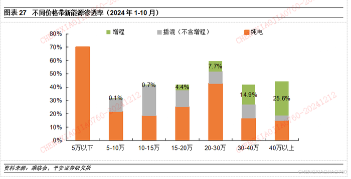 我们在2023年12月发布的2024年度策略《巨头双线出击,高端格局重塑》中认为2024年以头部新能源车企主导的价格战仍将延续,尤其是在10-20万元的主流价格带。我们判断2024年高端新能源将继续扩容,且格局将发生变化,在2024年将迎来几个重磅玩家,如华为生态圈、小米汽车等,同时我们判断华为生态圈在24年增量贡献显著,华为生态圈在2024年将成为高端新能源市场的重要一极。我们在2024年6月发布的中期策略报告《有质量的份额,助力行稳致远》中指出,2024年纯电车承压明显,插混车将保持高增长。在竞争格局方面,我们认为20万元以上插混(含增程)渗透率快速提升,市场规模扩容,竞争格局更好。