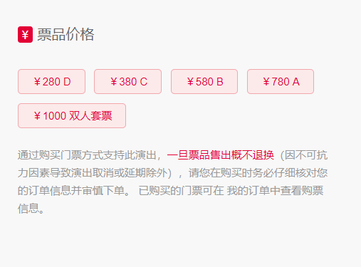 “秀动”官网演唱会页面均标注:通过购买门票方式支持此演出,(因不可抗力因素导致演出取消或延期除外),请您在购买时务必仔细核对您的订单信息并审慎下单。其中“一旦票品售出概不退换”突出显示为红色。