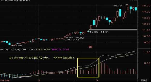 股价上升趋势下,MACD出现一片大红柱。股价进入调整后,MACD红柱减小。但随后股价出现放量阳线,把MACD的红柱再放大,此时属于MACD空中加油,仍继续看涨!