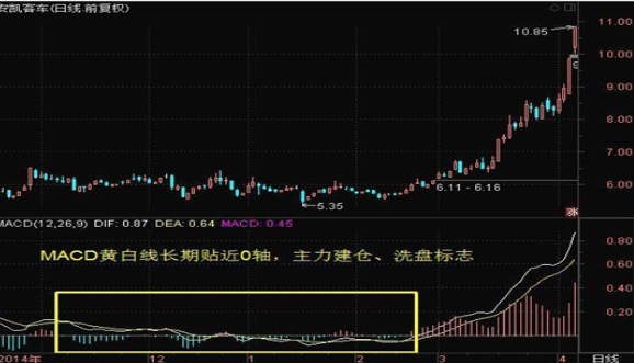 MACD黄白线长期贴近0轴运行,一旦向上发散,则股价向上爆发力度很强!