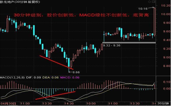 2、MACD底背离——(牛市多用30分钟图MACD底背离,可以有效把握买点!)